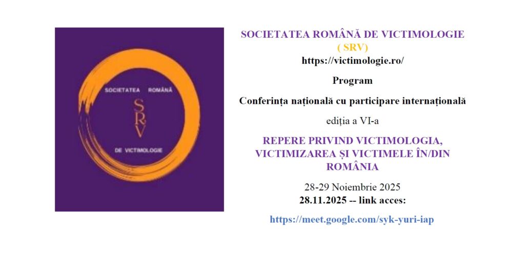 Societatea Română de Victimologie în parteneriat cu Universitatea Spiru Haret organizează în perioada 28-29 Noiembrie 2025 Conferința națională cu participare internațională ediția a VI-a REPERE PRIVIND VICTIMOLOGIA, VICTIMIZAREA ȘI VICTIMELE ÎN/DIN ROMÂNIA.